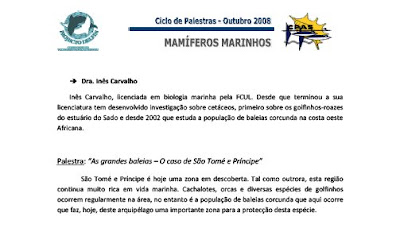 O Projecto Delfim, em colaboração com o CPAS (Centro Português de Actividades Subaquáticas), irá realizar durante o mês de Outubro um Ciclo de Palestras com o tema "Mamíferos Marinhos". Os oradores destas palestras são investigadores do Projecto Delfim e vão falar sobre o trabalho de investigação que se encontram a desenvolver.